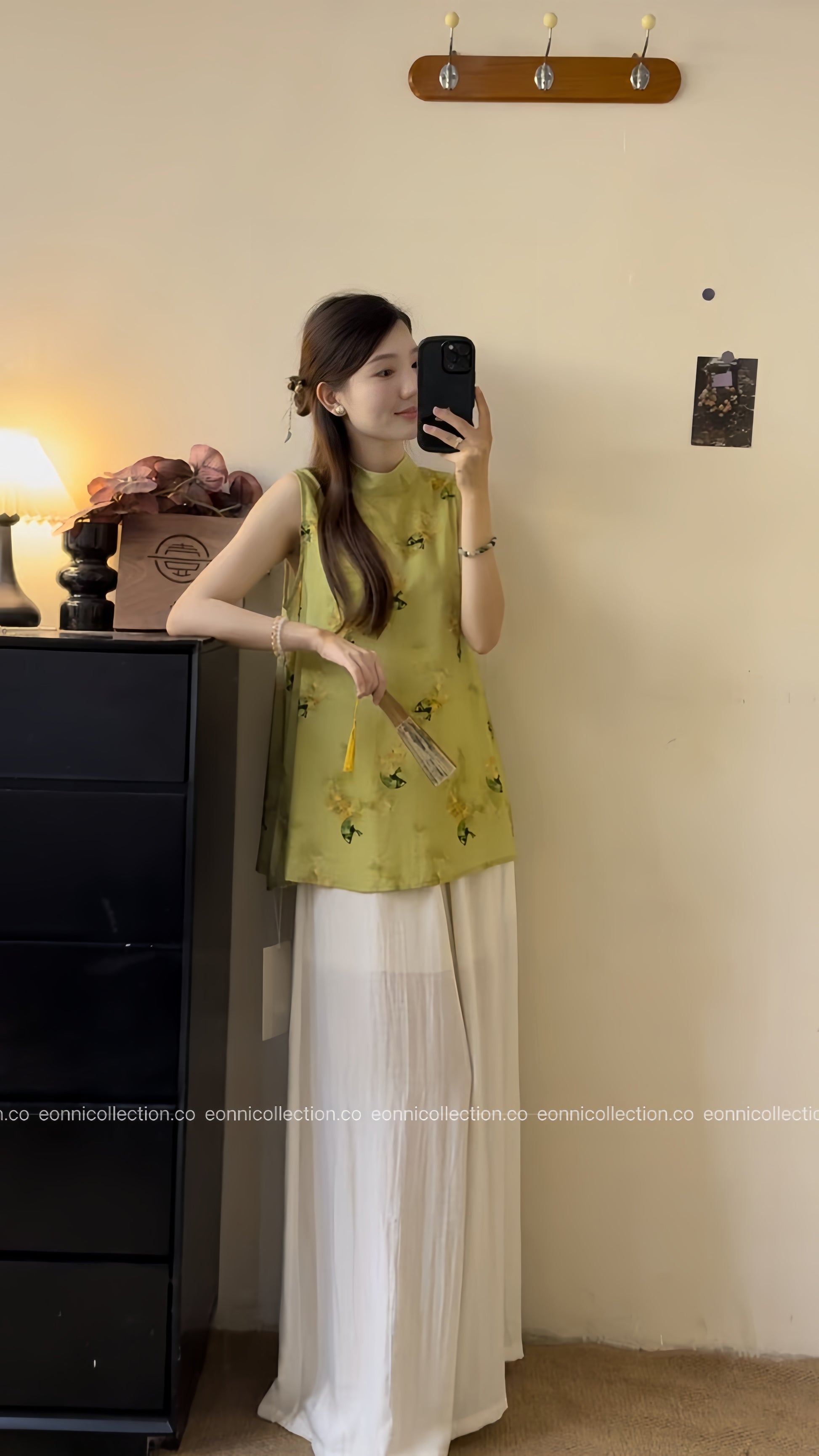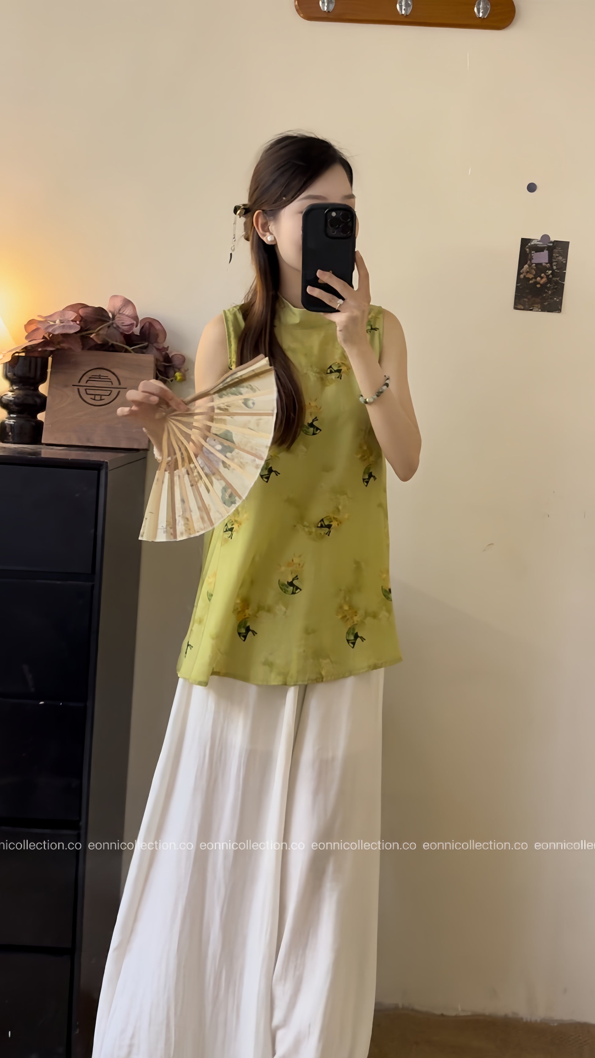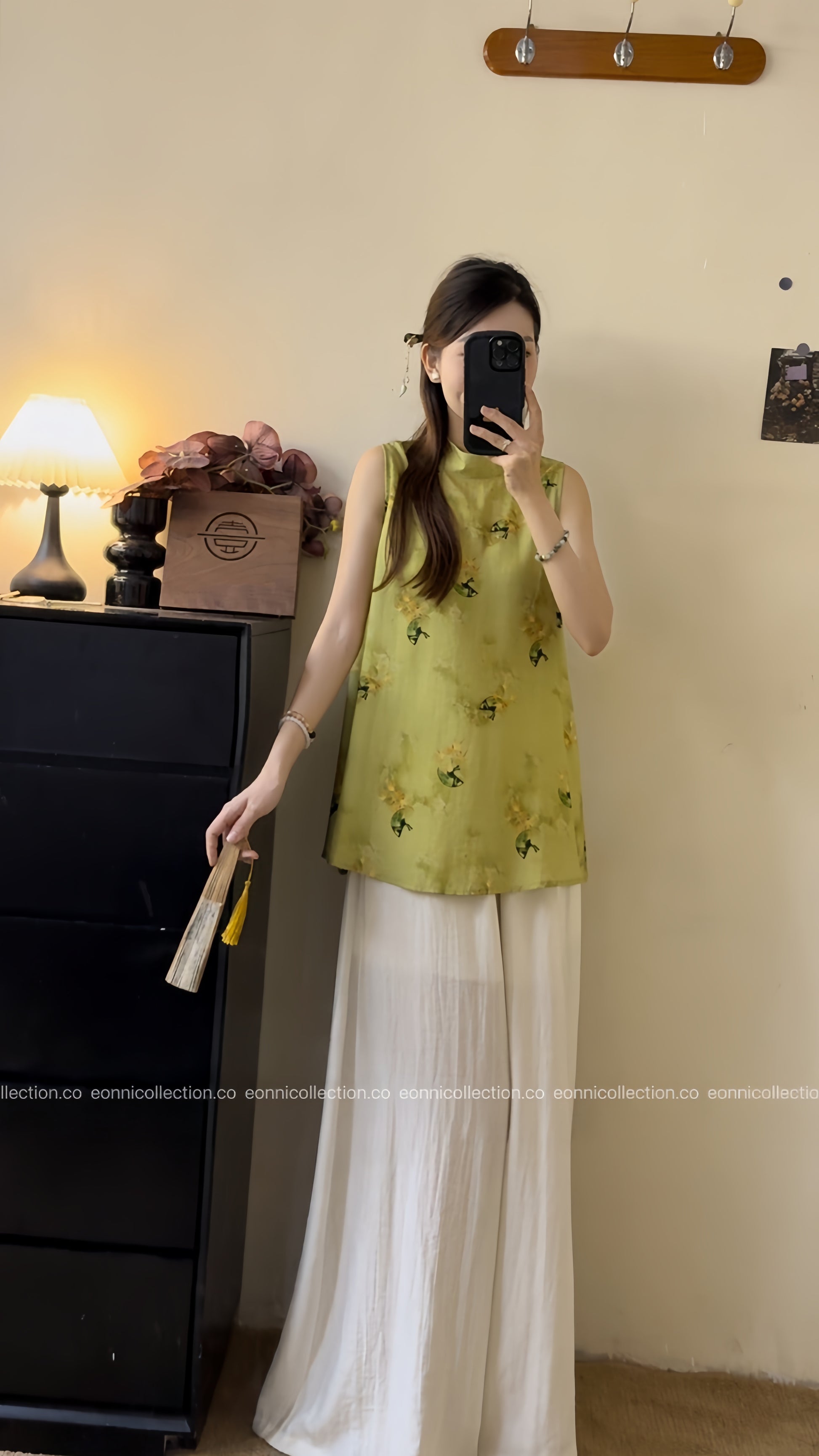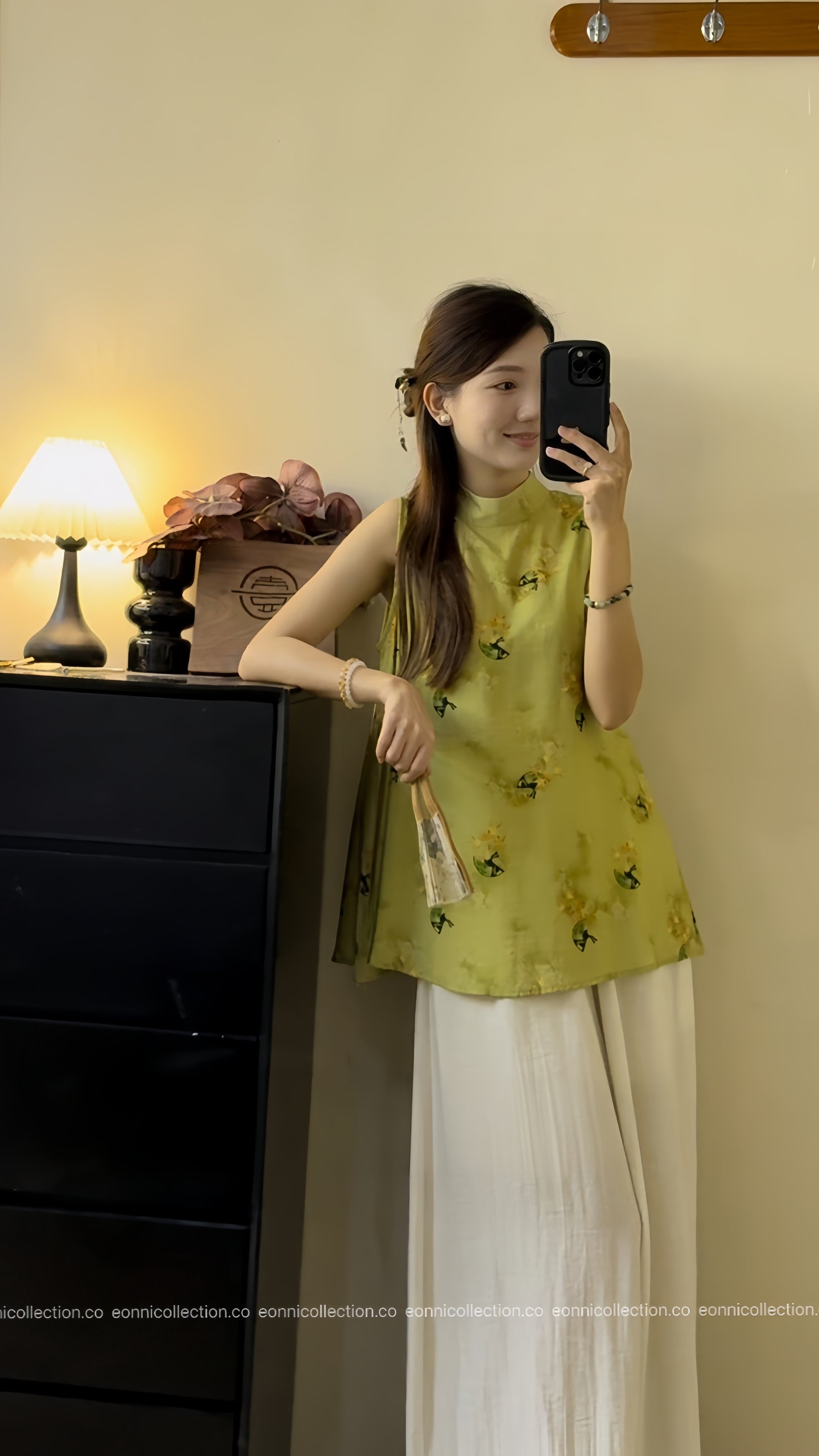 Inspired by classical oriental maiden paintings, this collection blends timeless elegance with everyday wearability. The tops are crafted from lightweight printed fabric, while the wide-leg pants are made of breathable linen-cotton for natural comfort and flow. A two-piece set that is graceful, versatile, and perfect for both casual outings and artistic gatherings.