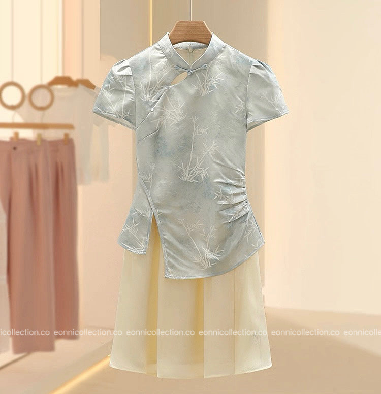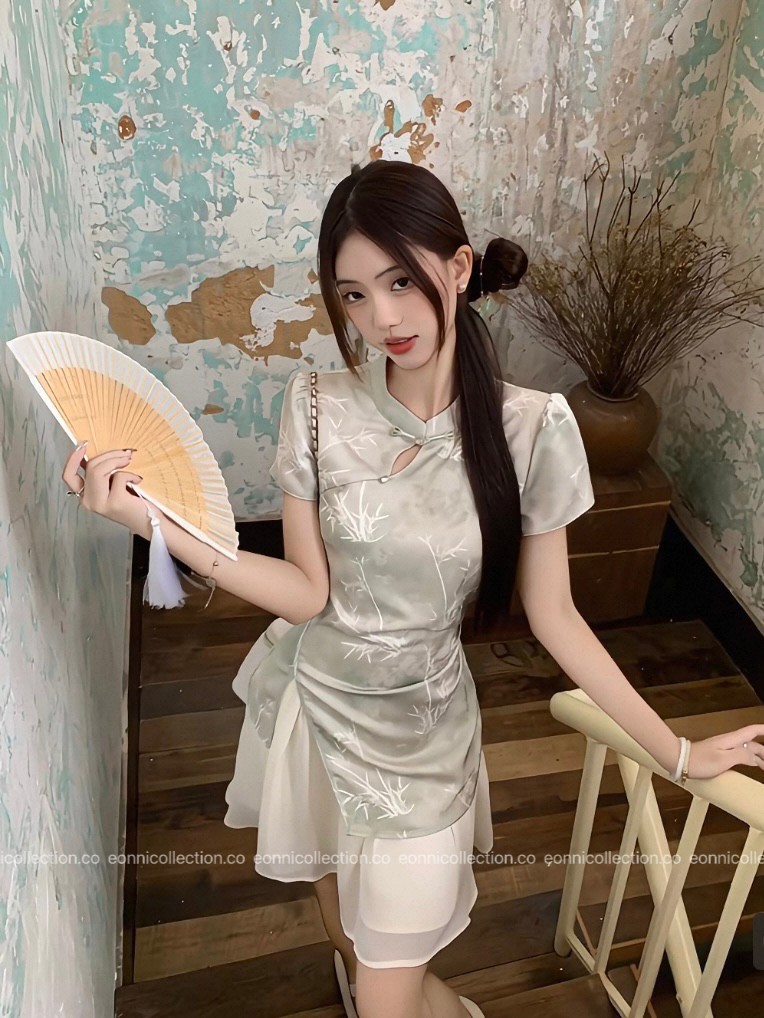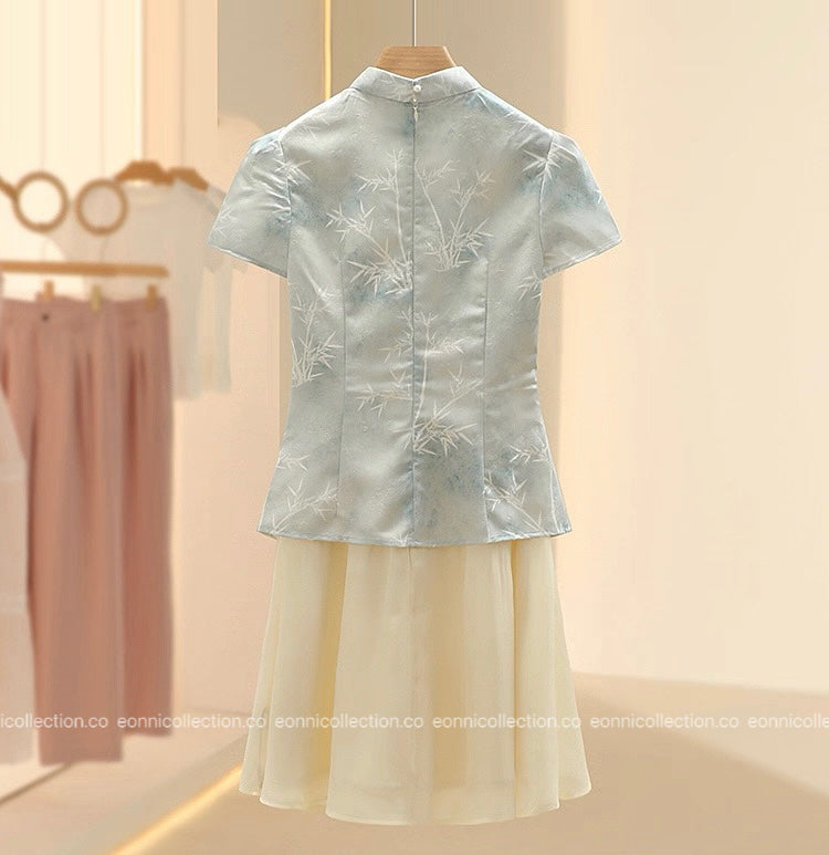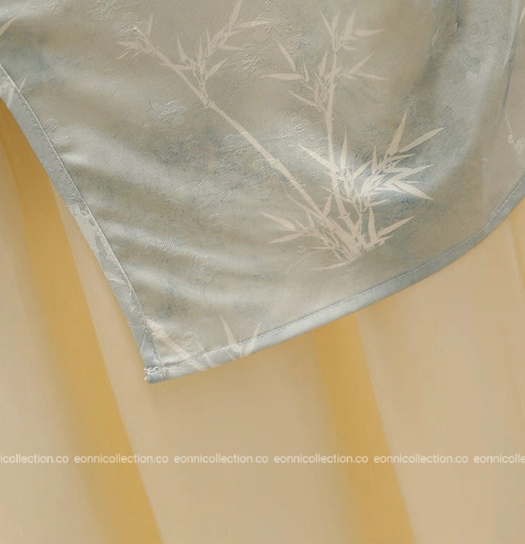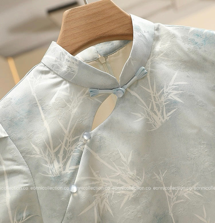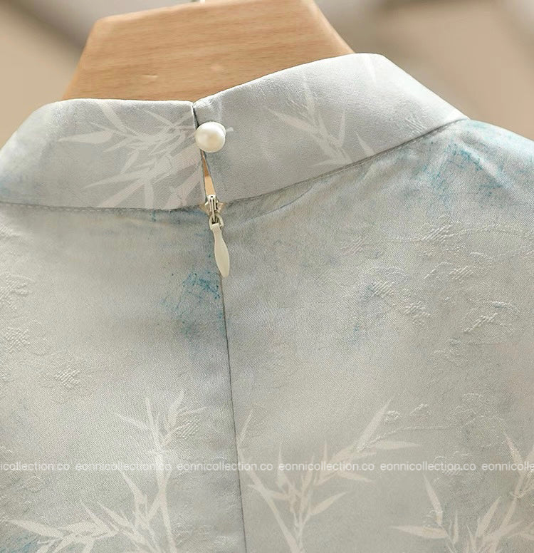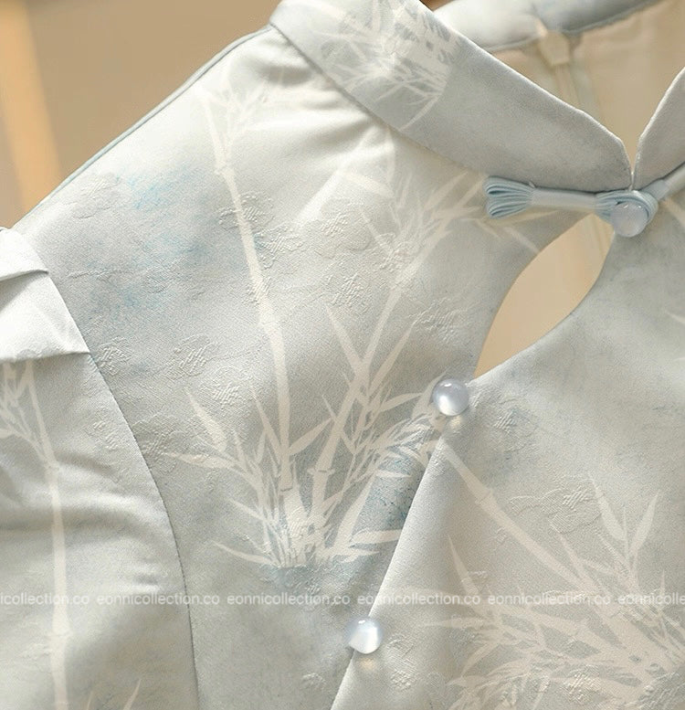 This cheongsam dress is crafted from a jacquard brocade top and a flowy shimmering mesh hem, blending classical elegance with modern grace. The light blue jacquard fabric features subtle bamboo patterns, symbolizing resilience and purity, while the beige shimmery mesh adds a lightweight, airy touch with a glowing finish. With its traditional mandarin collar and button details combined with a graceful skirt, this dress highlights feminine elegance in every step.