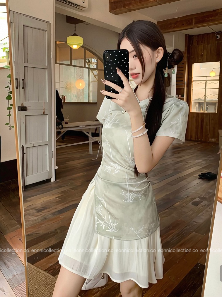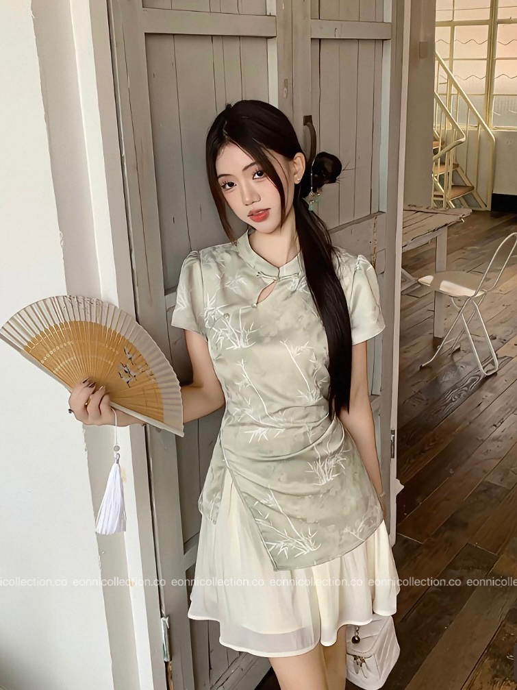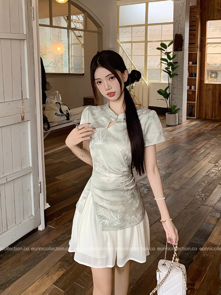 这款旗袍连衣裙采用提花锦缎搭配轻盈闪光纱,整体设计古典与现代融合。上身为 浅蓝竹叶提花锦缎,低调雅致,寓意坚韧与高洁;下摆拼接 米色闪光纱,轻盈通透,走动间散发灵动光泽。经典旗袍立领与盘扣,结合裙装的飘逸感,尽显东方女性的温婉与优雅。